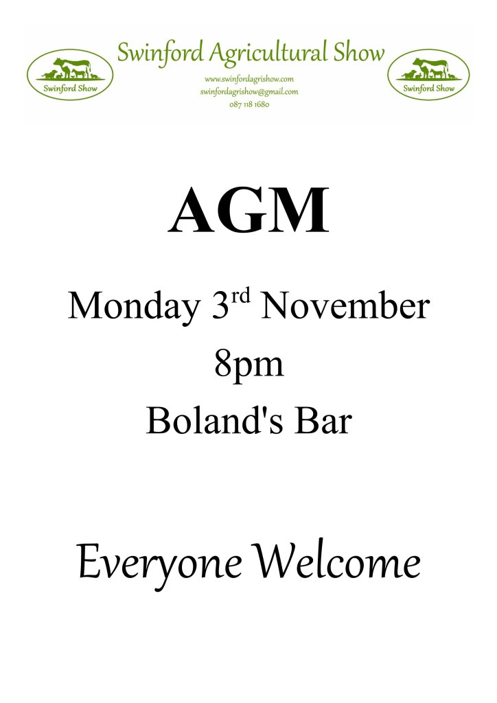 The Swinford Agricultural Show 2025 AGM will take place on Monday 3rd November at 8pm in Bolands Bar. All are welcome, especially new members.